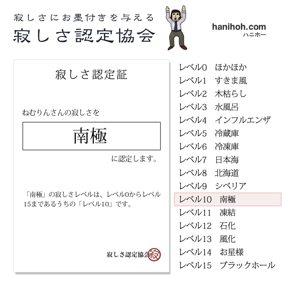 「南極」の寂しさレベルは、レベル0からレベル15まであるうちの「レベル10」です。